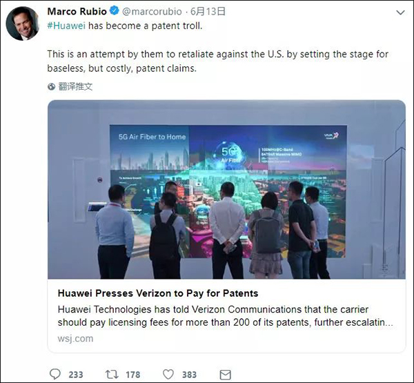 作為美國反華政客中最激進(jìn)最極端的一個人,盧比奧多次叫嚷中國“偷”美國“知識產(chǎn)權(quán)”。但是聽到這個消息后,他立馬撤下了那套“捍衛(wèi)者”的偽裝,給合理維權(quán)的華為扣上“專利流氓”的帽子,還宣稱華為的專利都是“沒有依據(jù)”的。