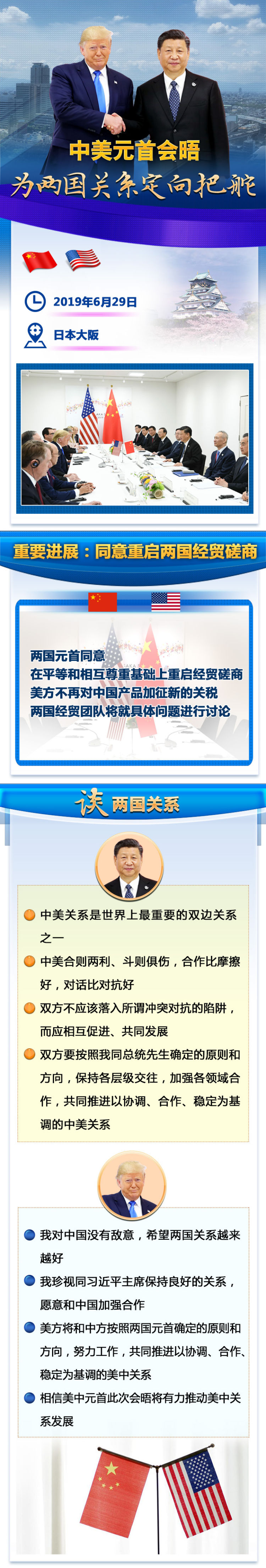 舉世矚目的中美元首會晤,于6月29日在日本大阪舉行。國家主席習(xí)近平同美國總統(tǒng)特朗普就事關(guān)中美關(guān)系發(fā)展的根本性問題、當(dāng)前中美經(jīng)貿(mào)摩擦以及共同關(guān)心的國際和地區(qū)問題深入交換意見,為下階段兩國關(guān)系發(fā)展定向把舵,同意推進(jìn)以協(xié)調(diào)、合作、穩(wěn)定為基調(diào)的中美關(guān)系。