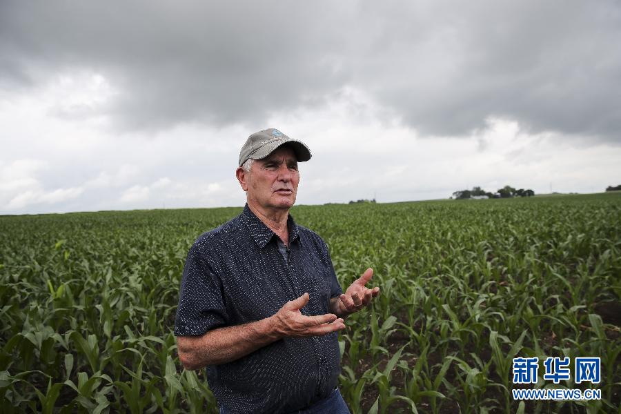 6月18日,在美國(guó)艾奧瓦州大西洋鎮(zhèn),農(nóng)場(chǎng)主比爾·佩雷特在自家的玉米地里接受采訪。?新華社記者 王迎 攝