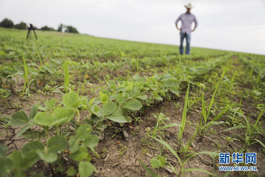 6月18日,在美國(guó)艾奧瓦州大西洋鎮(zhèn),農(nóng)場(chǎng)主比爾·佩雷特的兒子杰伊·佩雷特在自家田地里查看大豆的生長(zhǎng)情況。 新華社記者 王迎 攝
