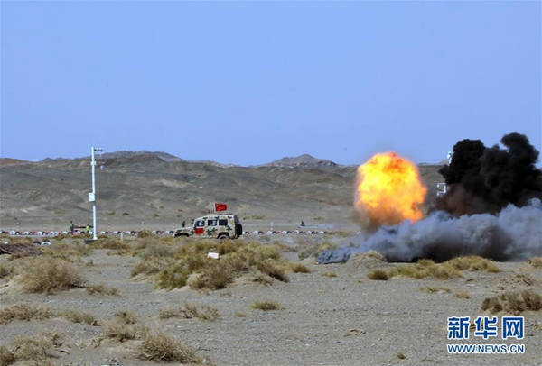 在“國際軍事比賽-2019”“安全環(huán)境”項目單組賽中,中國參賽隊快速通過雷爆區(qū)(8月8日攝)。新華社發(fā)(王軍強 攝)