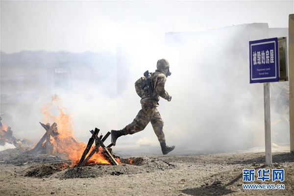 在“國際軍事比賽-2019”“安全環(huán)境”項目單組賽中,中國參賽隊員通過火障(8月8日攝)。新華社發(fā)(王鵬飛 攝)