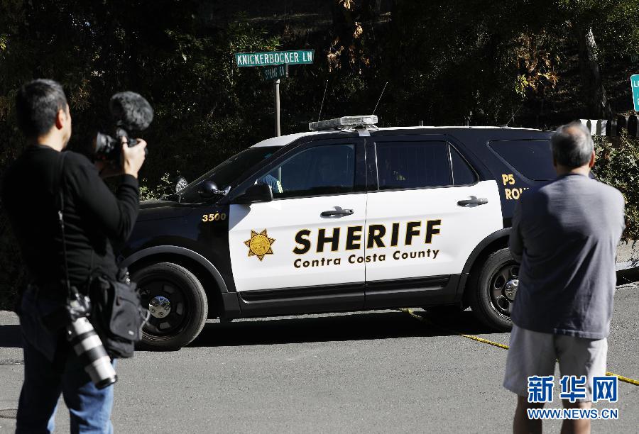 11月1日,在美國加利福尼亞州舊金山灣區(qū)北部的康特拉科斯塔縣奧林達,媒體記者在警戒線外采訪。新華社發(fā)(李建國攝)