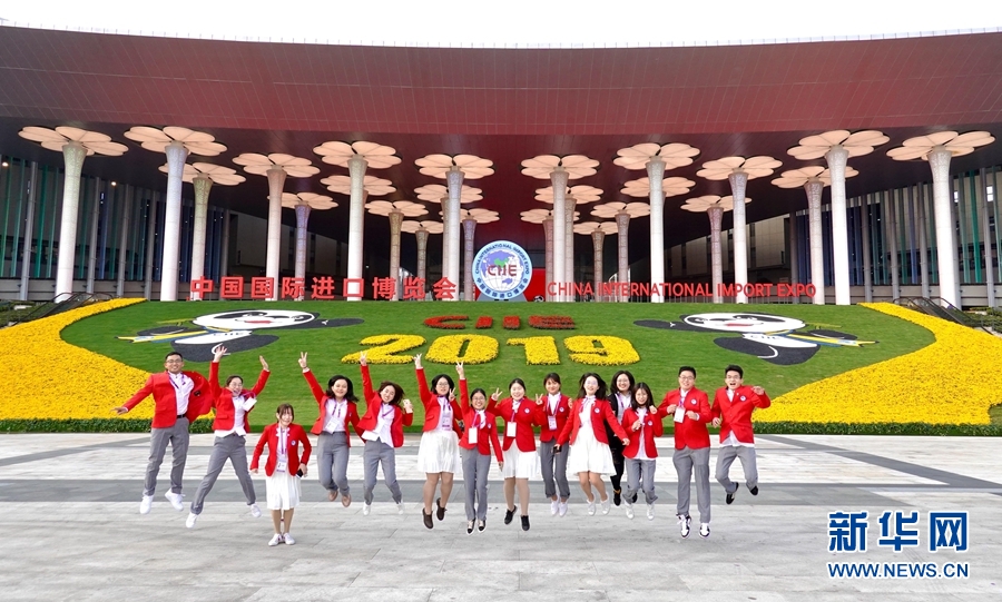 11月4日,第二屆進(jìn)博會(huì)部分志愿者在國(guó)家會(huì)展中心(上海)南廣場(chǎng)合影留念。 第二屆中國(guó)國(guó)際進(jìn)口博覽會(huì)將于11月5日上午在上海開幕。 新華社記者 才揚(yáng) 攝