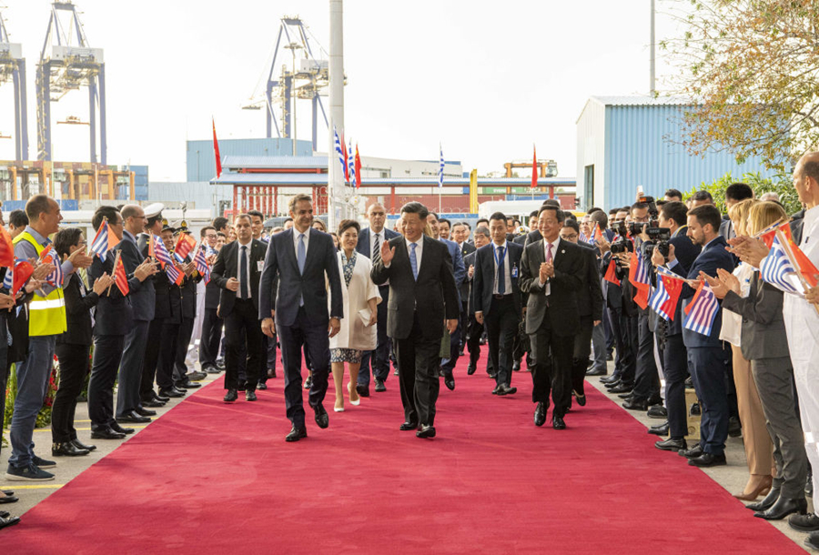 當(dāng)?shù)貢r(shí)間11月11日,國(guó)家主席習(xí)近平和夫人彭麗媛在希臘總理米佐塔基斯夫婦陪同下,共同參觀中遠(yuǎn)海運(yùn)比雷埃夫斯港項(xiàng)目。新華社記者李學(xué)仁攝
