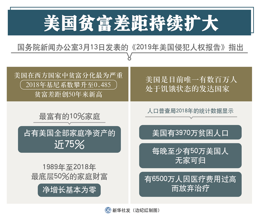 新華社北京3月13日電(記者王子銘、李超)國務(wù)院新聞辦13日發(fā)表的《2019年美國侵犯人權(quán)報告》指出,美國國民收入分配差距持續(xù)擴(kuò)大,底層民眾生活苦不堪言。