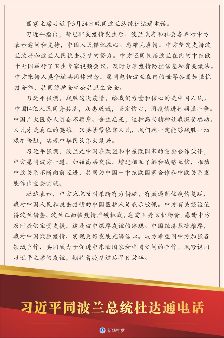 新華社北京3月24日電? 國家主席習(xí)近平24日晚同波蘭總統(tǒng)杜達(dá)通電話。