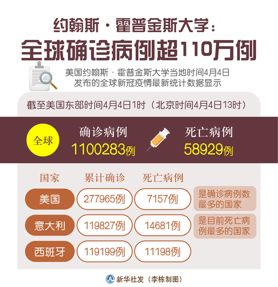 數(shù)據(jù)顯示,截至美國(guó)東部時(shí)間4日1時(shí)(北京時(shí)間4日13時(shí)),全球確診病例達(dá)1100283例,死亡病例為58929例。