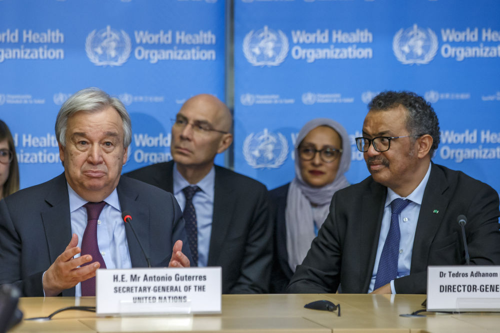 2月24日,在瑞士日內(nèi)瓦,聯(lián)合國(guó)秘書長(zhǎng)古特雷斯(左)在世界衛(wèi)生組織總部發(fā)表講話。新華社發(fā)
