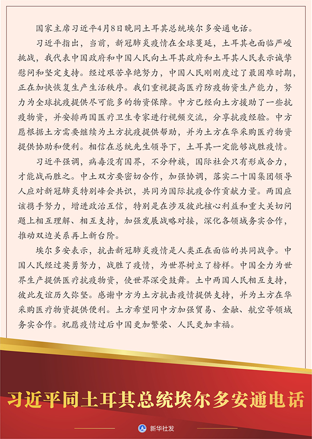 習(xí)近平指出,當(dāng)前,新冠肺炎疫情在全球蔓延,土耳其也面臨嚴(yán)峻挑戰(zhàn),我代表中國政府和中國人民向土耳其政府和土耳其人民表示誠摯慰問和堅(jiān)定支持。經(jīng)過艱苦卓絕努力,中國人民剛剛度過了最困難時期,正在加快恢復(fù)生產(chǎn)生活秩序。我們重視提高醫(yī)療防疫物資生產(chǎn)能力,努力為全球抗疫提供盡可能多的物資保障。中方已經(jīng)向土方援助了一些抗疫物資,并安排兩國醫(yī)療衛(wèi)生專家進(jìn)行視頻交流,分享抗疫經(jīng)驗(yàn)。中方愿根據(jù)土方需要繼續(xù)為土方抗疫提供幫助,并為土方在華采購醫(yī)療物資提供協(xié)助和便利。相信在總統(tǒng)先生領(lǐng)導(dǎo)下,土耳其一定能夠戰(zhàn)勝疫情。