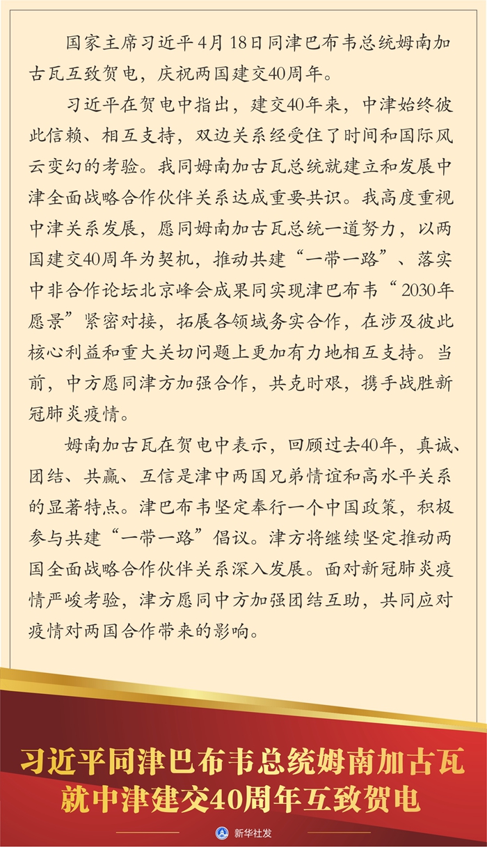 習近平在賀電中指出,建交40年來,中津始終彼此信賴、相互支持,雙邊關(guān)系經(jīng)受住了時間和國際風云變幻的考驗。我同姆南加古瓦總統(tǒng)就建立和發(fā)展中津全面戰(zhàn)略合作伙伴關(guān)系達成重要共識。我高度重視中津關(guān)系發(fā)展,愿同姆南加古瓦總統(tǒng)一道努力,以兩國建交40周年為契機,推動共建“一帶一路”、落實中非合作論壇北京峰會成果同實現(xiàn)津巴布韋“2030年愿景”緊密對接,拓展各領(lǐng)域務(wù)實合作,在涉及彼此核心利益和重大關(guān)切問題上更加有力地相互支持。當前,中方愿同津方加強合作,共克時艱,攜手戰(zhàn)勝新冠肺炎疫情。