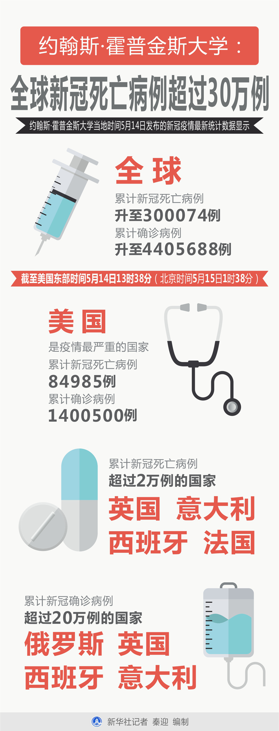 新華社紐約5月14日電 美國約翰斯·霍普金斯大學(xué)14日發(fā)布的新冠疫情最新統(tǒng)計數(shù)據(jù)顯示,全球累計新冠死亡病例超過30萬例。