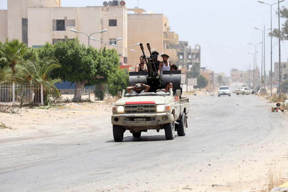 6月4日,利比亞民族團(tuán)結(jié)政府軍駕車駛?cè)氲睦璨ɡ锬喜康貐^(qū)。(新華社發(fā),哈姆扎·圖爾基亞攝)