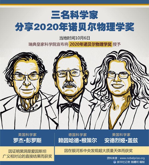 新華社斯德哥爾摩10月6日電(記者和苗 付一鳴)瑞典皇家科學(xué)院6日宣布,將2020年諾貝爾物理學(xué)獎(jiǎng)授予三名科學(xué)家。英國(guó)科學(xué)家羅杰·彭羅斯因證明黑洞是愛(ài)因斯坦廣義相對(duì)論的直接結(jié)果而獲獎(jiǎng);德國(guó)科學(xué)家賴(lài)因哈德·根策爾和美國(guó)科學(xué)家安德烈婭·蓋茲因在銀河系中央發(fā)現(xiàn)超大質(zhì)量天體而獲獎(jiǎng)。