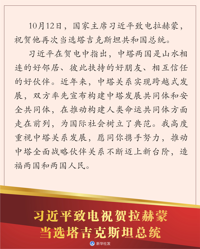 圖表:習(xí)近平致電祝賀拉赫蒙當(dāng)選塔吉克斯坦總統(tǒng) 新華社發(fā)