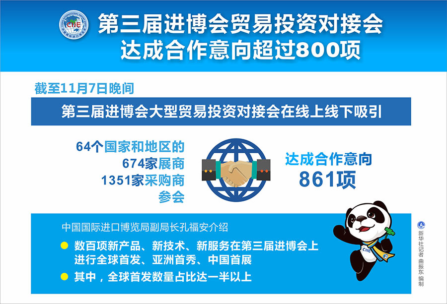新華社上海11月8日電(記者周蕊、于佳欣)記者8日從第三屆中國國際進(jìn)口博覽會展中新聞通氣會上了解到,截至7日晚間,第三屆進(jìn)博會大型貿(mào)易投資對接會在線上線下吸引64個國家和地區(qū)的674家展商、1351家采購商參會,達(dá)成合作意向861項。