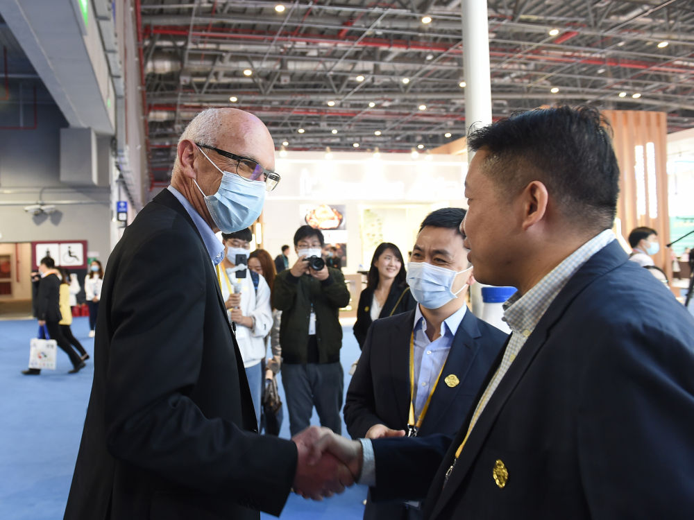 11月5日,羅伊(左)在第三屆進(jìn)博會(huì)現(xiàn)場(chǎng)同合作伙伴交談。