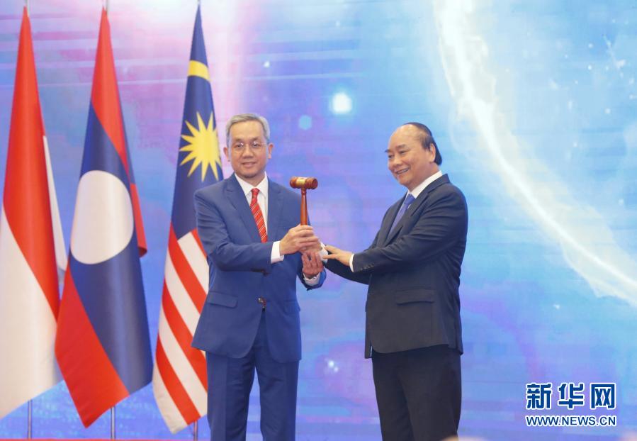11月15日,在越南首都河內(nèi)舉行的第37屆東盟峰會及東亞合作領(lǐng)導(dǎo)人系列會議閉幕式上,越南總理阮春福(右)將象征東盟輪值主席國身份的木槌移交給文萊駐越南大使。新華社/越通社