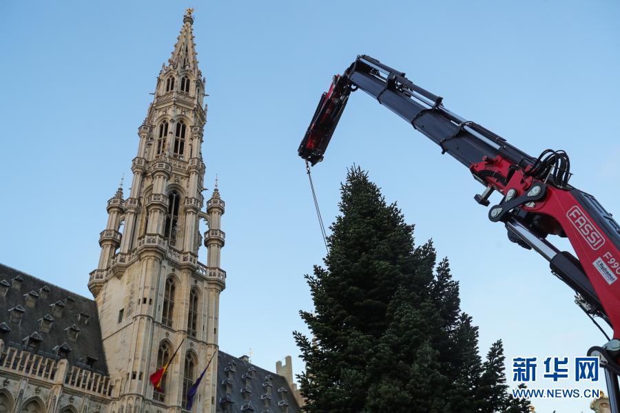 這是11月19日在比利時(shí)布魯塞爾大廣場(chǎng)拍攝的圣誕樹(shù)安裝現(xiàn)場(chǎng)。