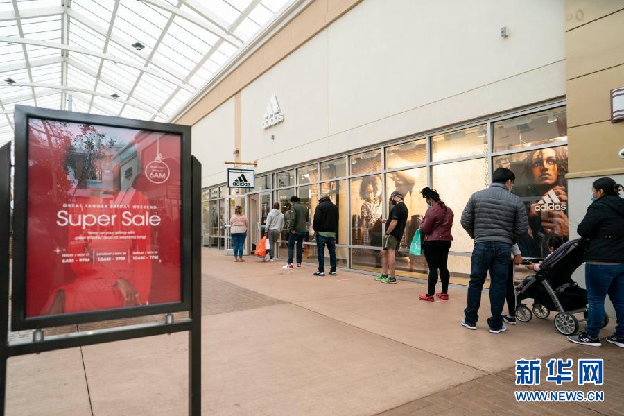11月27日,人們在美國馬里蘭州國家港灣一處購物中心排隊(duì)等待進(jìn)店購物。