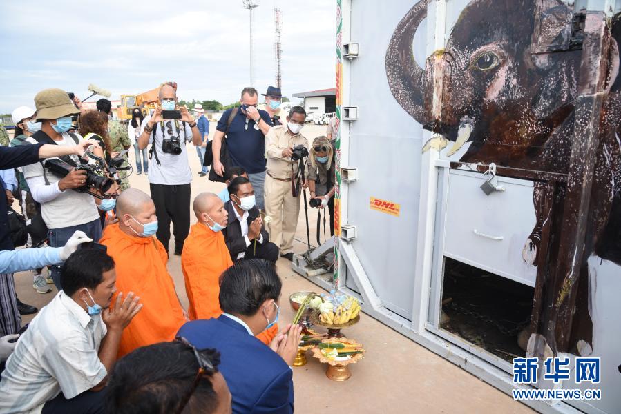 11月30日,在柬埔寨暹粒國際機(jī)場,僧人為大象“卡萬”祈福。