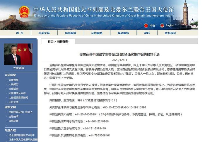 中國駐英國大使館已經(jīng)指導(dǎo)受害人報警,但此類案件偵破難度極大,追回被騙款項可能性很小。為避免類似事件再次發(fā)生,中國駐英國大使館提醒在英中國留學(xué)生提高警惕,切莫盲目相信陌生人或貪圖小便宜,更不要輕易進入陌生人的車輛或房間,如遇可疑人員盡快脫身并視情報警。緊急情況下可聯(lián)系中國駐英國使領(lǐng)館尋求協(xié)助。