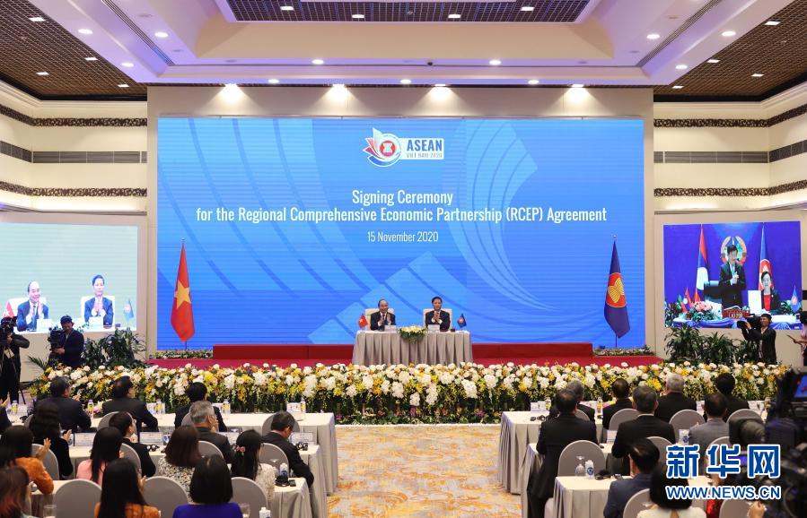 這是11月15日在越南首都河內拍攝的區(qū)域全面經濟伙伴關系協(xié)定(RCEP)簽署儀式現(xiàn)場。新華社/越通社