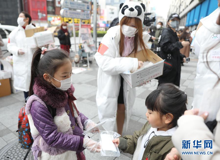 2月29日,在日本東京的池袋站前,在日華僑華人志愿者團體“口罩熊貓行動小組”向當地民眾免費發(fā)放口罩,一名小志愿者(左)將兒童用口罩送給日本小朋友。新華社記者 杜瀟逸 攝