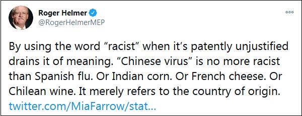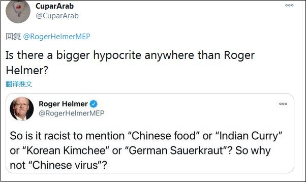不料,這條評論徹底“翻車”。赫爾默是一名英國獨(dú)立黨成員,政治立場偏保守,批評英國的國家醫(yī)療服務(wù)體系(NHS),并否定歐盟的氣候政策。過去一年間,他曾多次將新冠病毒污蔑為“中國病毒”,還曾轉(zhuǎn)發(fā)過特朗普的相關(guān)視頻。