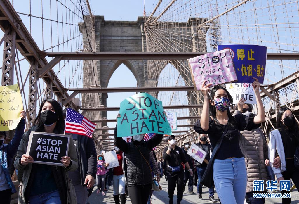 2021年4月4日,反對(duì)亞裔仇恨的游行隊(duì)伍走過美國紐約的布魯克林大橋。2020年以來,由于少數(shù)美國政客借疫情污名化亞裔,致使針對(duì)亞裔的種族歧視和仇恨犯罪不斷升級(jí)。 新華社記者 王迎 攝