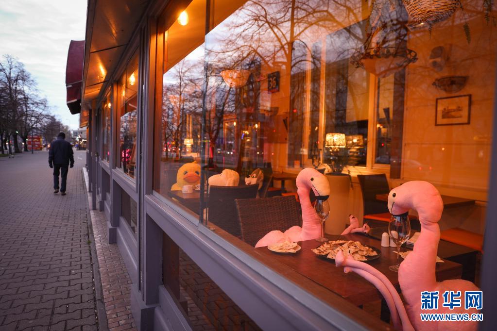 4月13日,波蘭首都華沙一家餐館將動(dòng)物玩偶擺放在靠窗座位上吸引顧客。