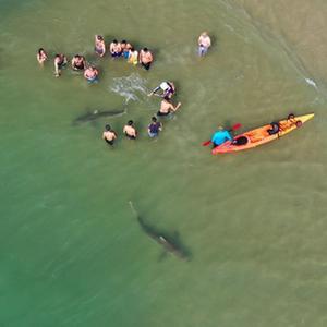 4月20日,在以色列北部城市哈代拉的海邊,鯊魚從人們身邊游過(無人機照片)。