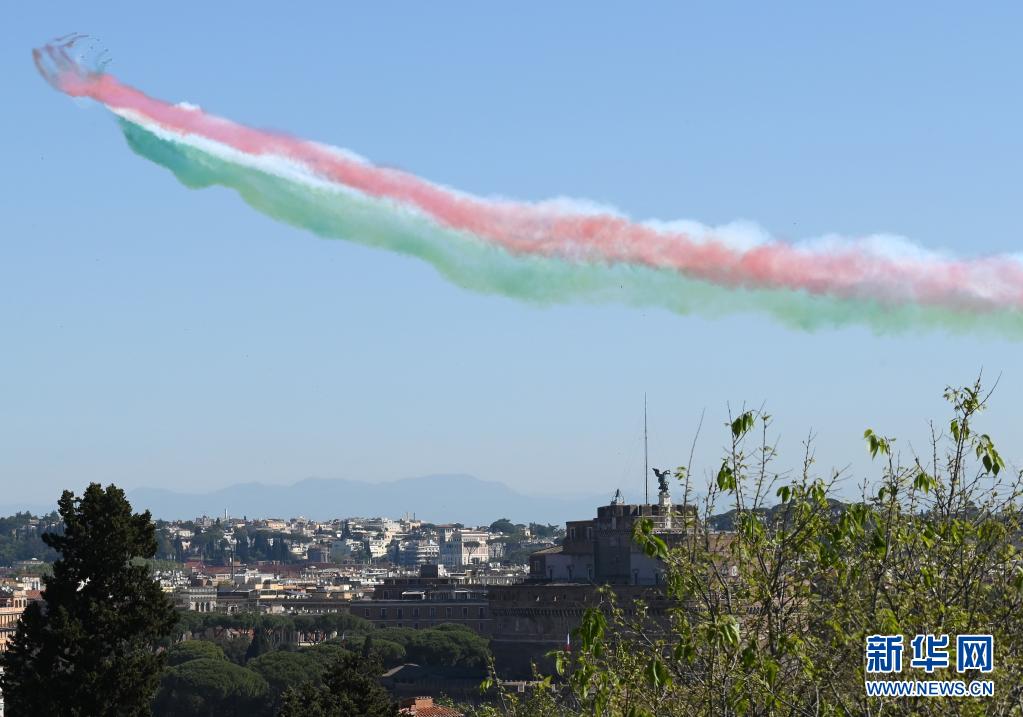 4月25日,意大利“三色箭”飛行表演隊(duì)在羅馬舉行的紀(jì)念儀式上噴出代表意大利國(guó)旗顏色的紅白綠三色煙霧。