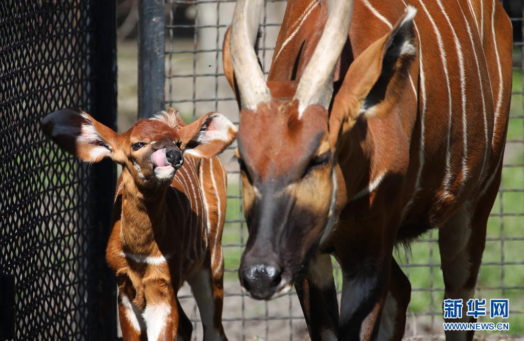 5月10日,兩周大的幼年山地紫羚與母親一起在波蘭首都華沙的華沙動(dòng)物園的籠舍中散步。