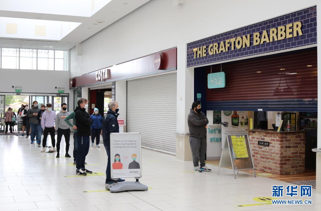5月10日,人們在愛爾蘭首都都柏林一家重新恢復(fù)營業(yè)的理發(fā)館外排隊。