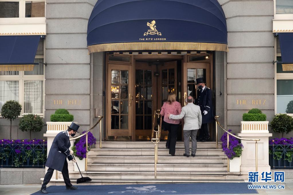 5月17日,工作人員在英國(guó)倫敦一家酒店門前迎接顧客。