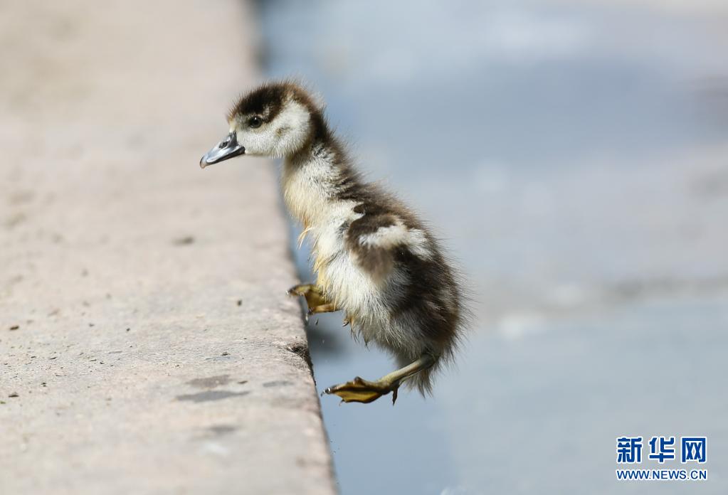 5月19日,一只埃及雁幼鳥在德國法蘭克福的美茵河畔覓食。