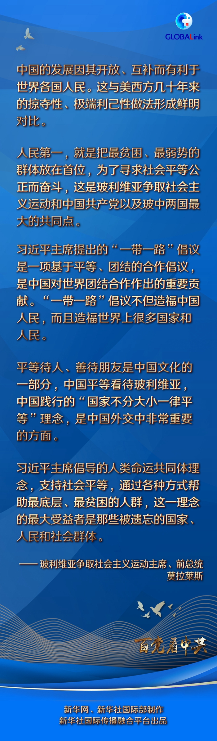 莫拉萊斯指出,習(xí)近平主席倡導(dǎo)的人類命運(yùn)共同體理念,支持社會平等,通過各種方式幫助最底層、最貧困的人群,這一理念的最大受益者是那些被遺忘的國家、人民和社會群體。